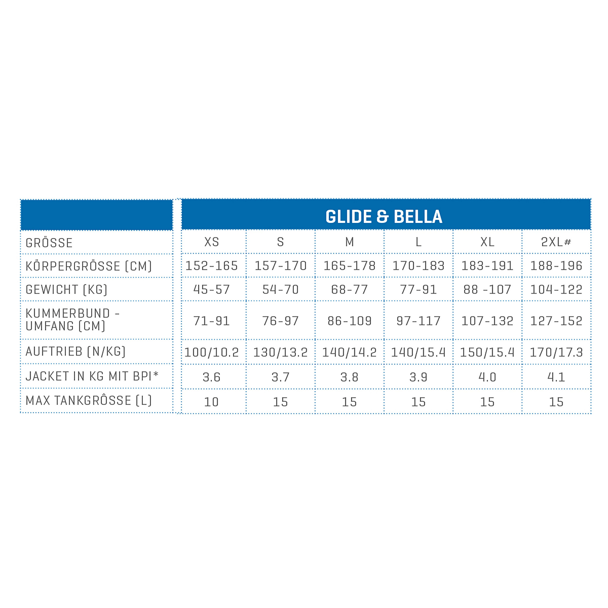 Das Glide verfügt über eine umlaufende Blase und ist optimal ausbalanciert. Damit ermöglicht es eine sehr entspannte Schwimmposition an der Oberfläche. Es ist mit einem Y-förmigen Schultergurtsystem ausgestattet, das das Tarierjacket eng am Körper hält und so eine hervorragende Tarierkontrolle und eine hohe Bewegungsfreiheit der Arme ermöglicht. Im Zentrum des Y-Schultergurtes liegt ein dreieckiger Edelstahlring, von dem aus die Zugkräfte gleichmäßig auf den gesamten Körper verteilt werden, unabhängig von den Tauchbedingungen oder der Position im Wasser. Der untere Gurt verbindet sich mit dem Rucksack, wo es auf den Kummerbund trifft und für eine sichere sowie bequeme Verbindung sorgt. Das Ventilsystem umfasst drei Ventile der neuen Generation, die es dir ermöglichen, die Luftblase dieses ADV-Jackets in jeglicher Schwimmlage zu leeren.