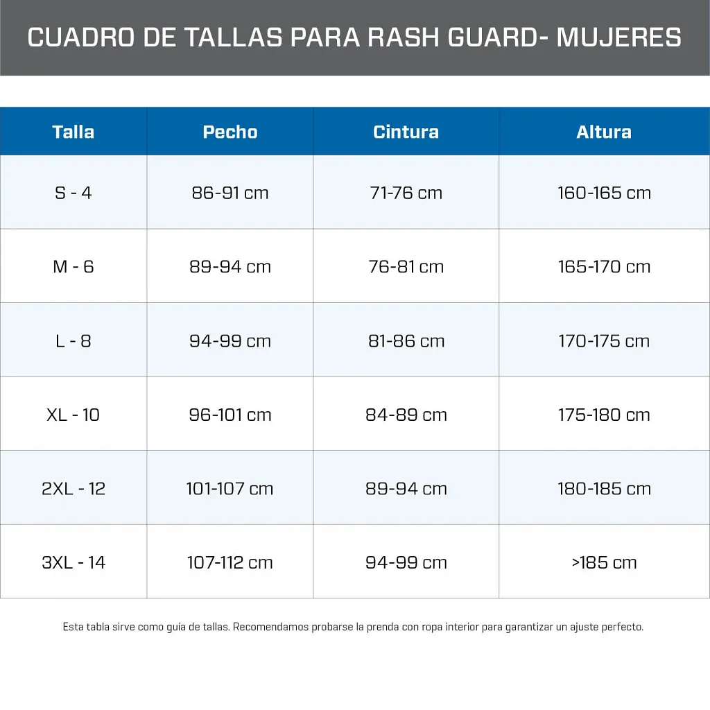 - Esta camiseta rash guard ceñida está diseñada para el buceo en aguas tropicales o como capa debajo de un traje de neopreno. Si prefiere un ajuste más holgado, puede elegir una talla más grande.