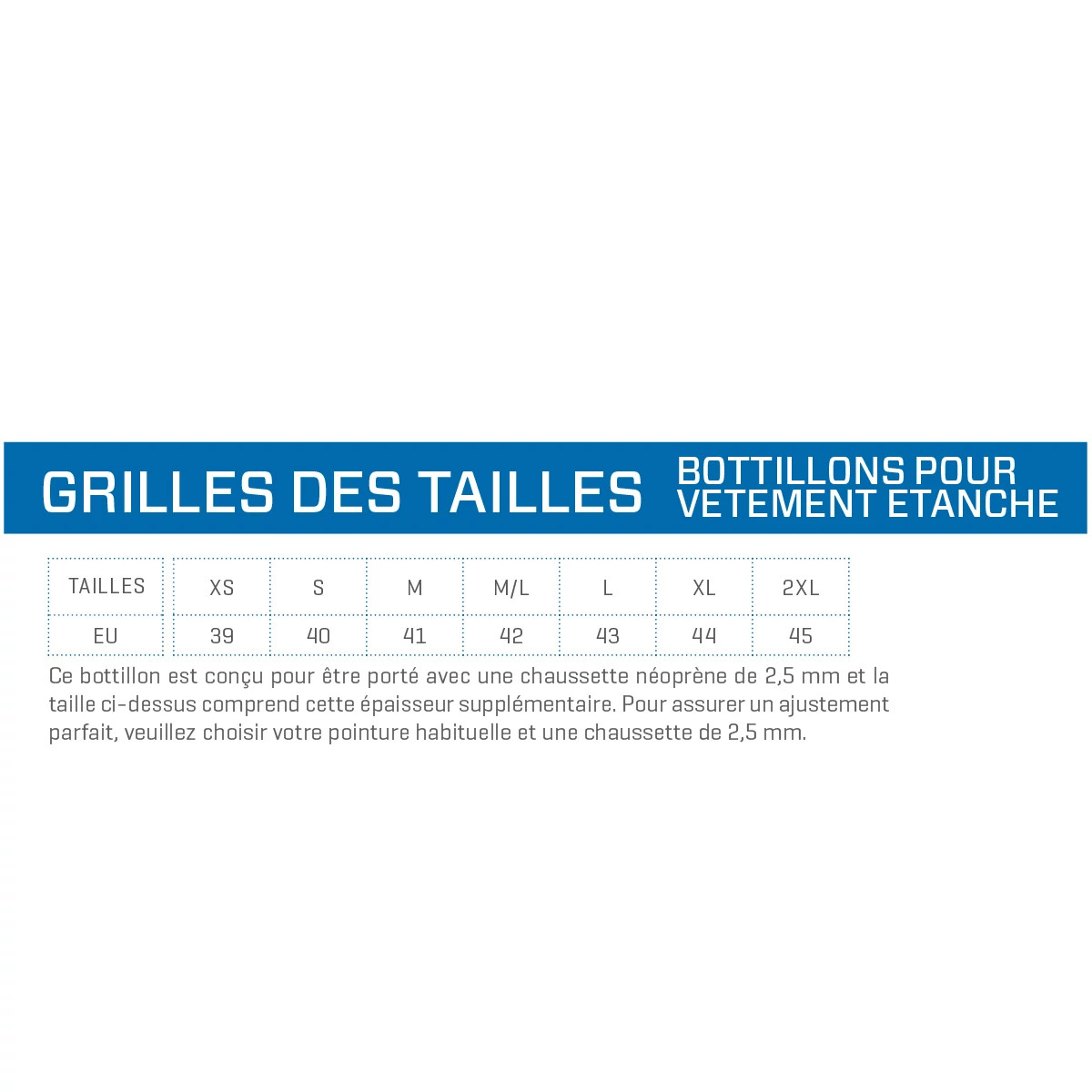 - Ce bottillon est conçu pour être porté avec une chaussette néoprène de 2,5 mm et la taille ci-dessus comprend cette épaisseur supplémentaire. Pour assurer un ajustement parfait, veuillez choisir votre pointure habituelle et une chaussette de 2,5 mm.
