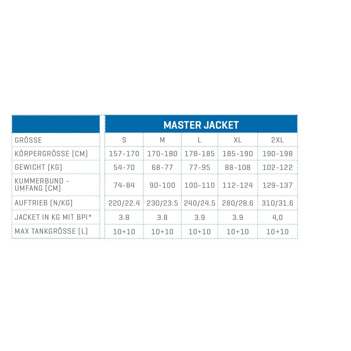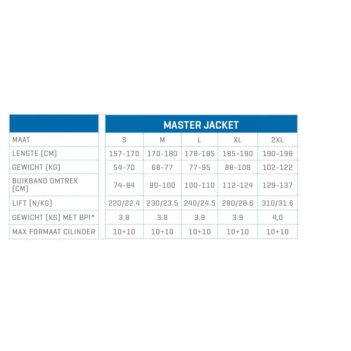 Master Jacket è progettato con passaggi interni che consentono all'aria di fluire senza limitazioni e accumularsi nel punto più alto dell'equilibratore. Offre anche una notevole capacità di spinta in tutte le taglie e consente di assumere la posizione supina in superficie. Pertanto, Master Jacket è stato certificato come Dispositivo combinato di galleggiamento e salvataggio (Combined Buoyancy and Rescue Device - CBRD). È l'equilibratore preferito dai subacquei commerciali e militari, dagli istruttori di immersione e dai subacquei esperti.