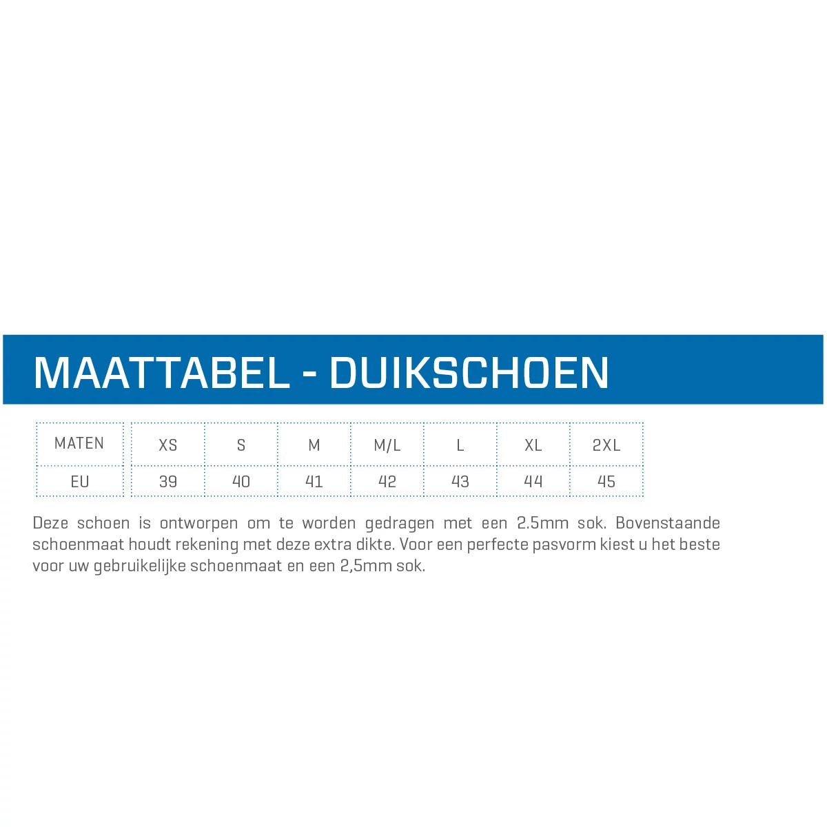 - Deze schoen is ontworpen om te worden gedragen met een 2.5mm sok. Bovenstaande schoenmaat houdt rekening met deze extra dikte. Voor een perfecte pasvorm kiest u het beste voor uw gebruikelijke schoenmaat en een 2,5mm sok.