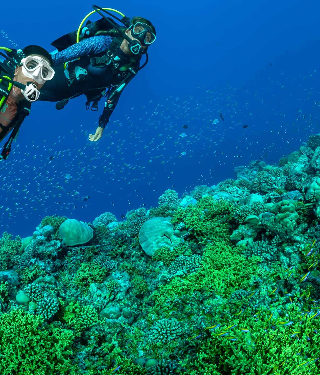 Scuba divers using C370 Dive Regulators underwater above a coral reef.